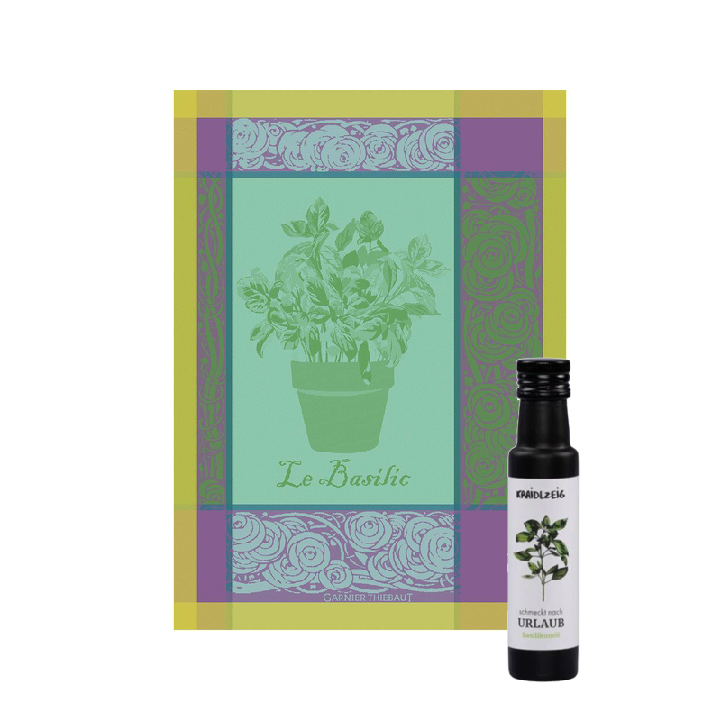 Das Geschirrtuch “Basilic” von Garnier Thiebaut und das feine Würzöl BIO-Basilikum von Kraidlzeig sind in einer attraktiven Tragebox verpackt