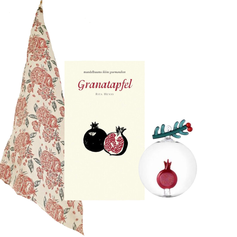 Das in Cellophan verpackte Geschenkpaket enthält eine Glaskugel mit innen liegendem Granatapfel von Ichendorf Milano, das Buch Granatapfel aus der Serie “kleine gourmandisen” vom Mandelbaum-Verlag und das Geschirrtuch Granatina von Busatti