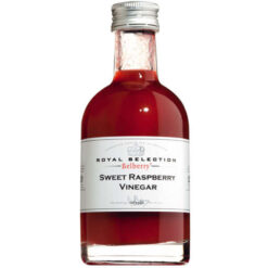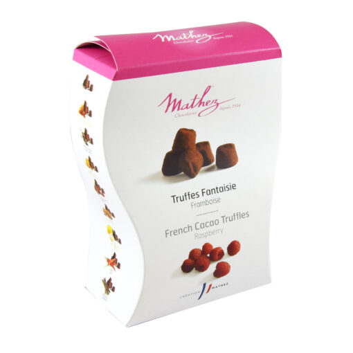 Das Geschenkpaket aus Himbeeressig, Schokotrüffeln mit Himbeere und dem Buch Himbeere aus mandelbaums kleinen gourmandisen ist in Cellophan verpackt.