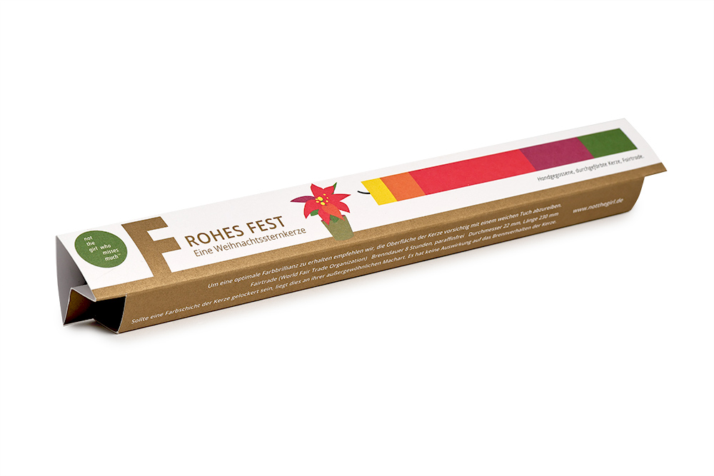 Ein Geschenk, Glückwunsch oder ein Gruß – jedes Thema findet bei uns seine passende Kerze, einzeln in einer farbigen Kartonage verpackt. Die Kerze besteht aus durchgefärbtem Wachs – aufwendig wird bei ihrer Fertigung Farbschicht für Farbschicht von Hand gegossen.