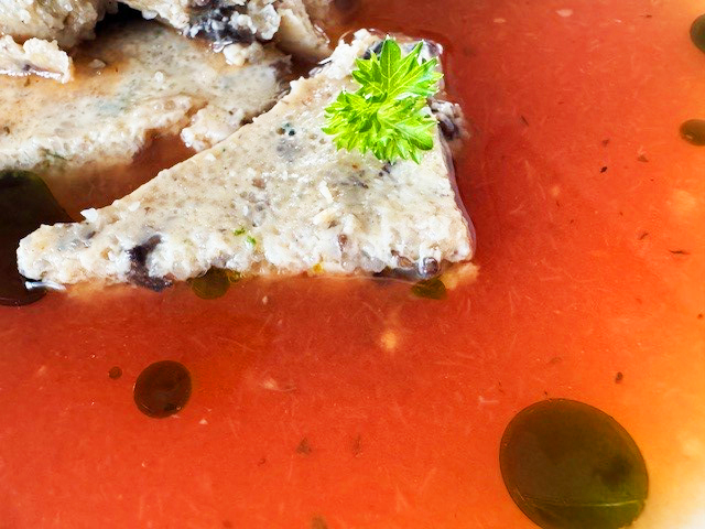 Champignon-Polenta-Schöberl in klarer Tomatensuppe