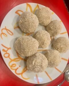 Die Butter schaumig rühren, die Eier verschlagen. Den Käse fein reiben und unter die Brösel mischen. Buttermasse und Bröselmasse miteinander verrühren und mit Salz und ggf. Pfeffer, Piment d´Espelette und Muskatnuß abschmecken. Ca. 30 Minuten an einem kühlen Ort rasten lassen. TIPP: Wenn man die Masse in den Kühlschrank stellt, ca 10 Minuten vor der Weiterverarbeitung herausnehmen. Kleine Knödel formen und ca. 5 Minuten in Salzwasser sieden und weitere 5 Minuten ziehen lassen. Herausnehmen, abtropfen und kurz überkühlen lassen Die Knödel durch übrig gebliebenes Ei /Eiweiß oder Milch ziehen und in den Bröseln wenden. Das Öl auf ca 150°C erhitzen und die Knöderl darin frittieren bis sie eine goldbraune Farbe annehmen. Abfetten und rasch servieren. |